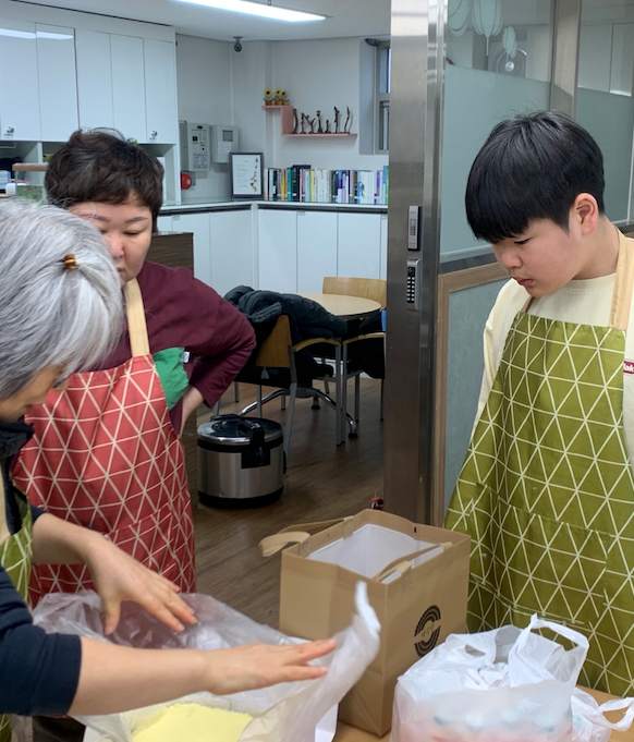 I made pancakes and served food for our beloved senior citizens. I served a box of Taegeukdang Castella rice cake which my mother prepared. The person in charge of the Love House thanked me that the elderly would like it because it was soft and delicious.